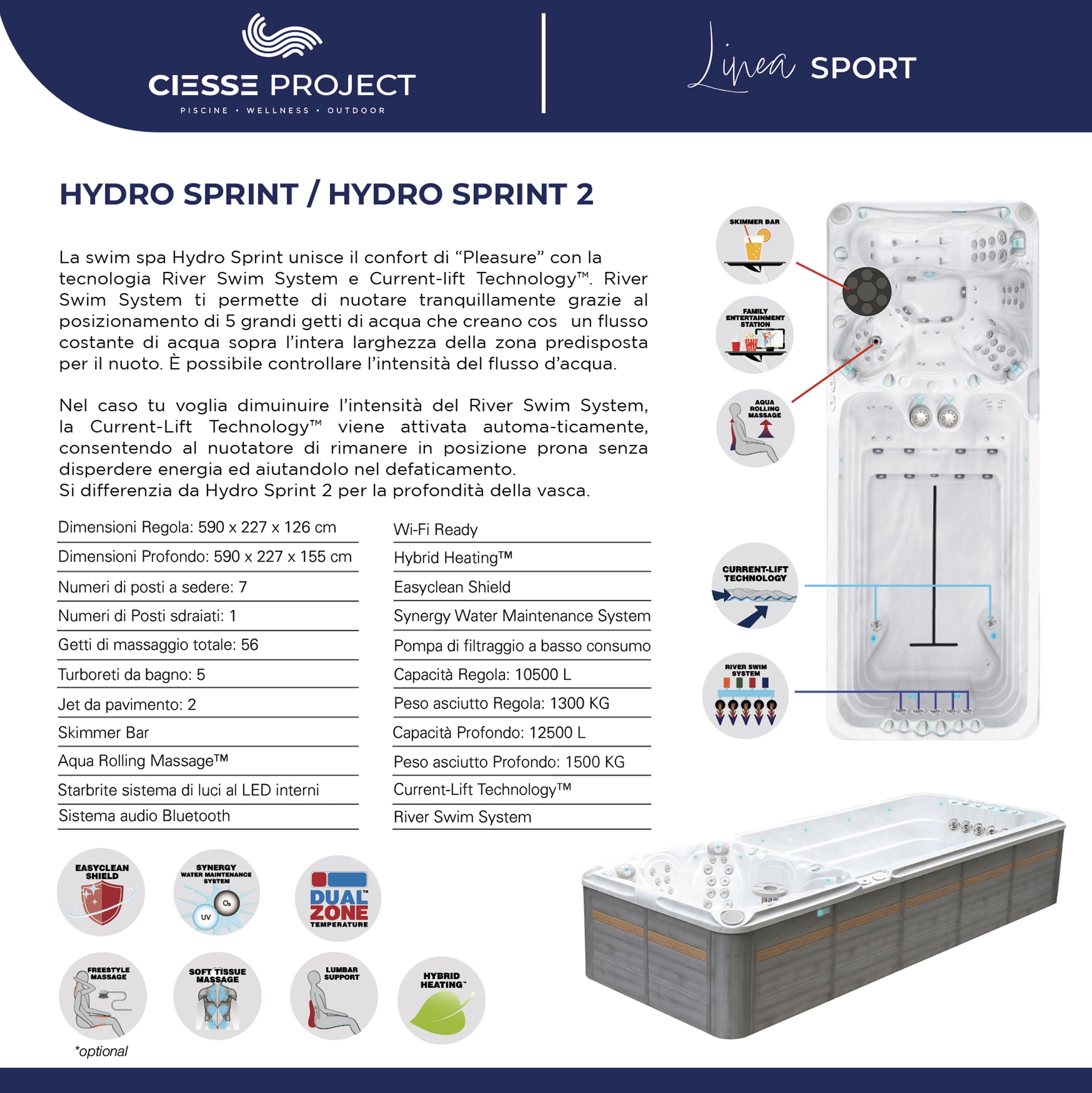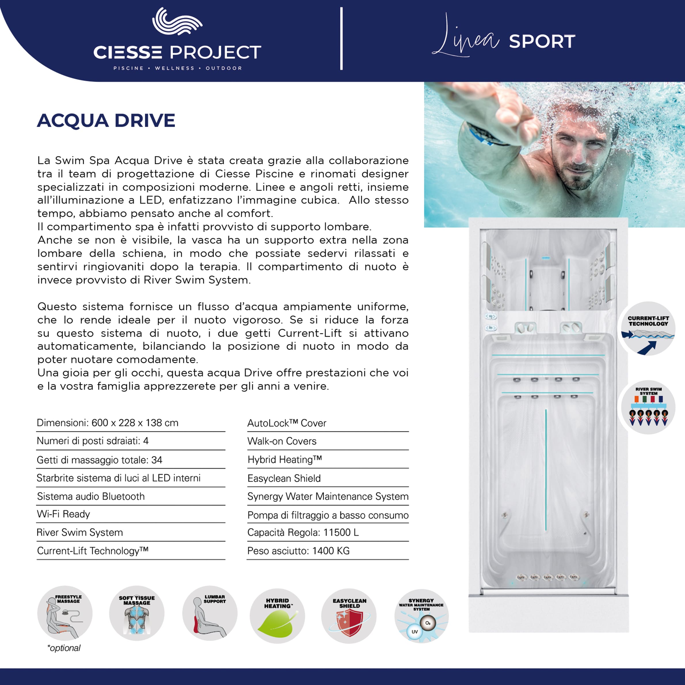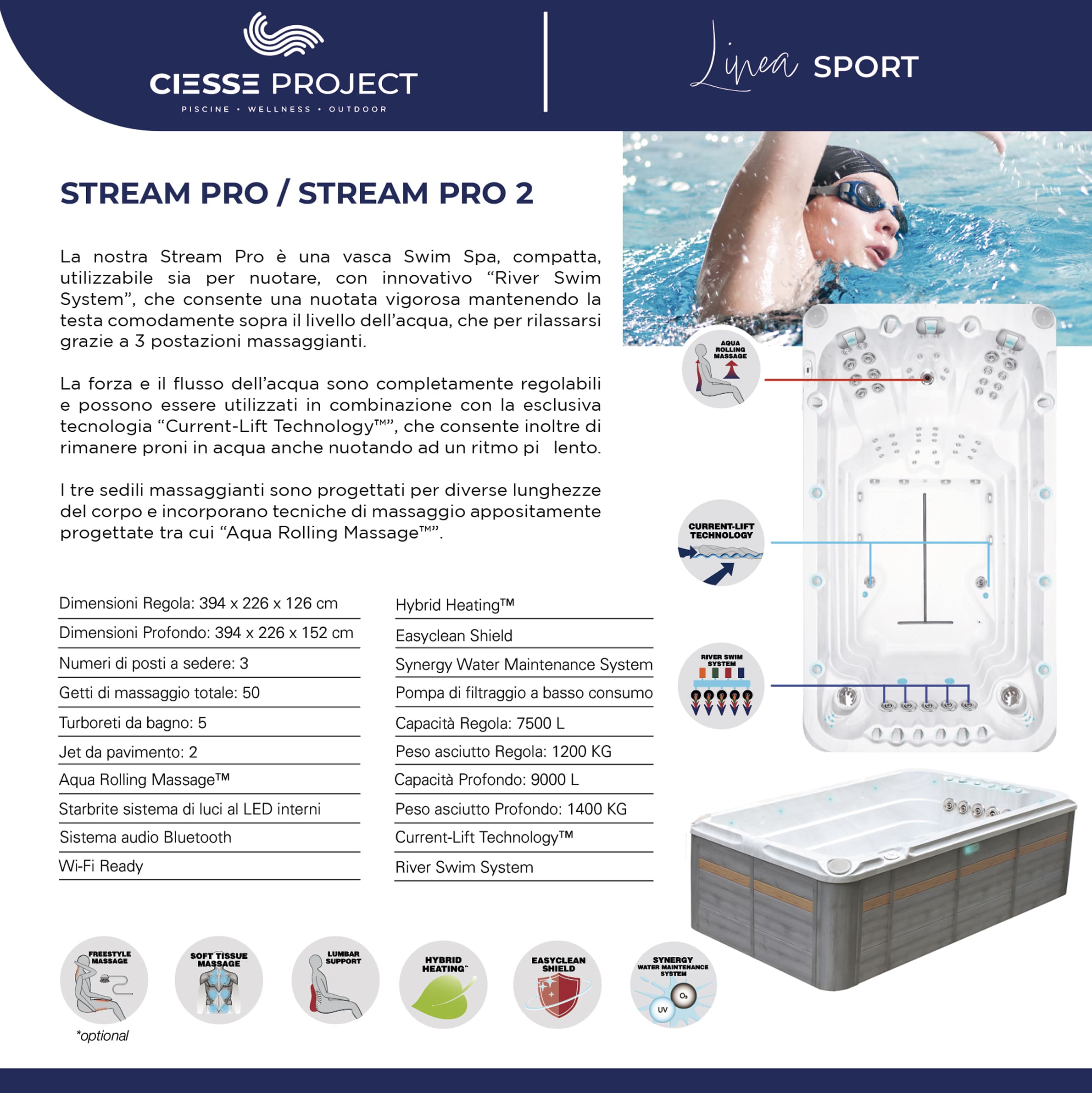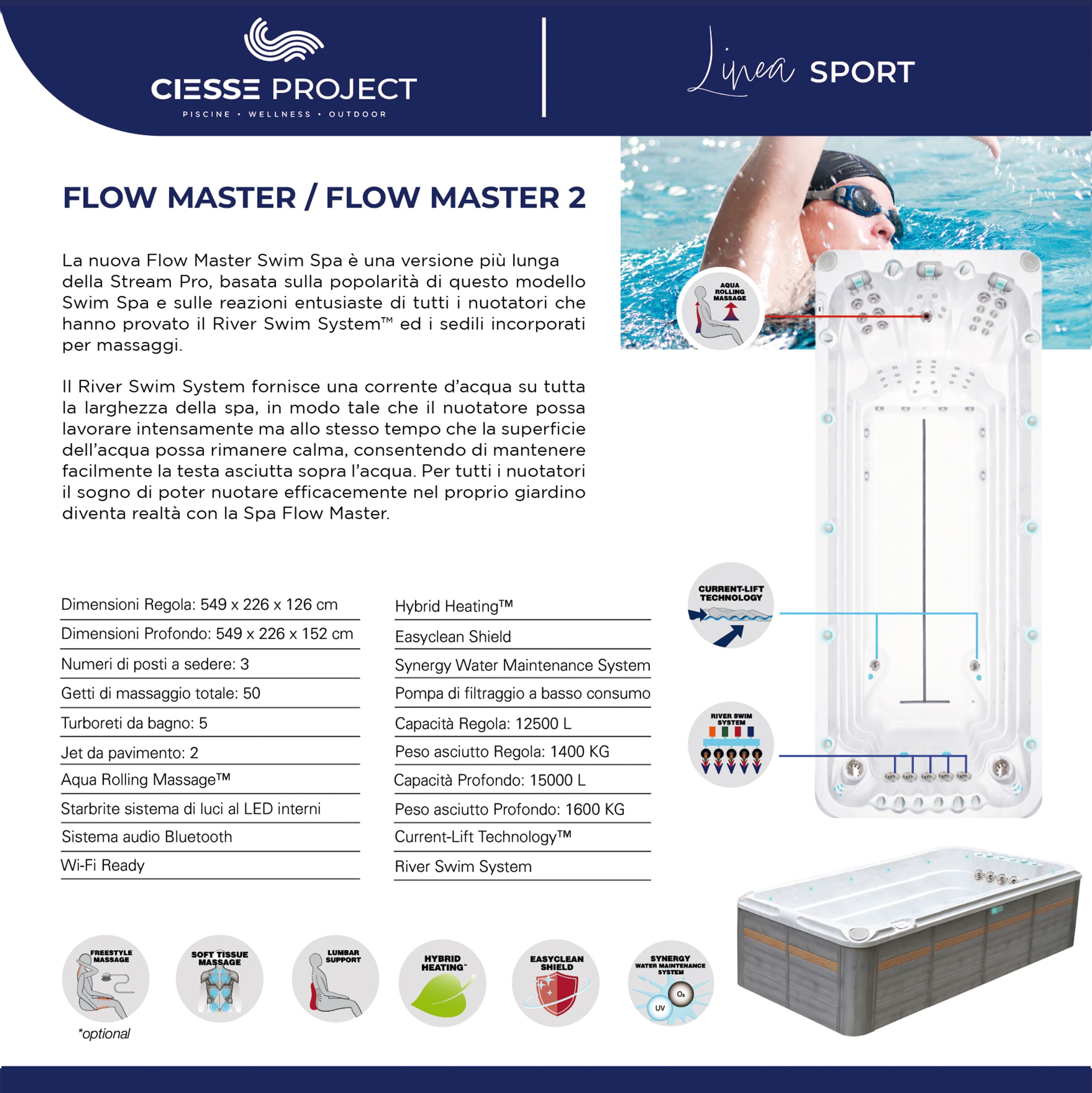 Queste speciali vasche sono le uniche al mondo ad avere la speciale tecnologia “Current-Lift Technology” che consente al nuotatore di rimanere perfettamente in orizzontale sulla superficie dell’acqua.
